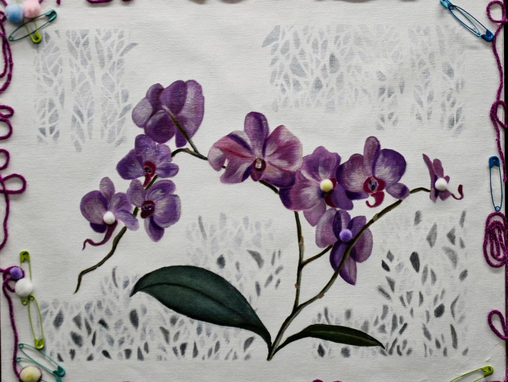 Medium: oil, yarn, safety pins,pom-poms, stone.